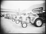Außenaufnahme. Ausgestellte Traktoren. Darüber eine Tafel mit der Aufschrift "Schlüter"