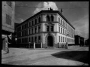 Außenaufnahme. Gebäude mit der Aufschrift "R. Scuola tecnica commerciale. Duca di Pistoia."
