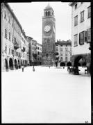 Ripresa in esterno. Piazza con una torre dell'orologio a Riva del Garda