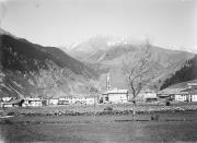 Predazzo con la Chiesa Arcipretale dei Santi Filippo e Giacomo (esercitazione militare con le armi 1908)